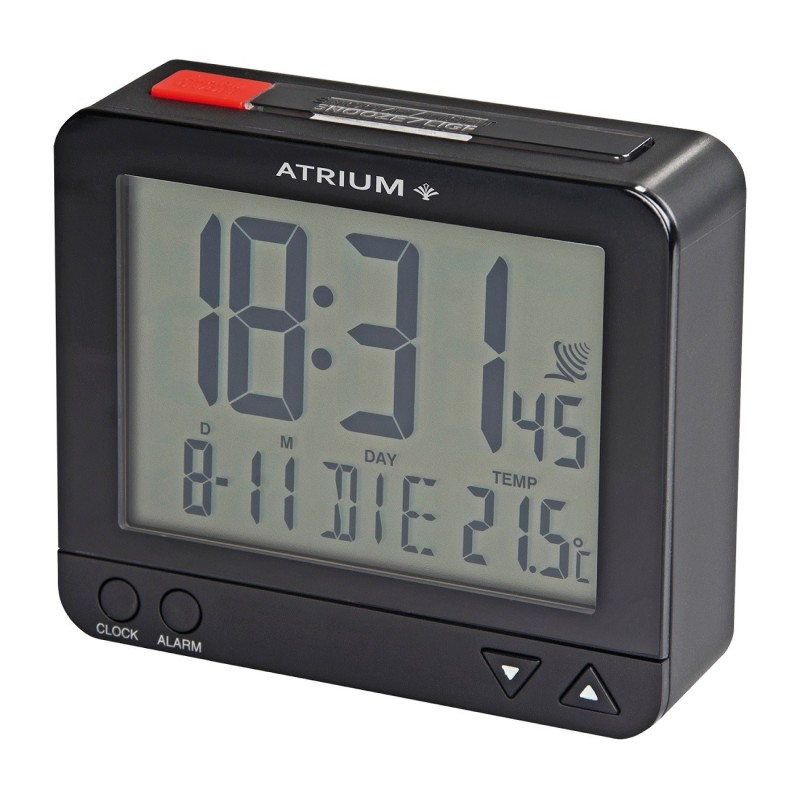 De best doordachte wekker van ATRIUM! Zowel de opvallende rode schakelaar op de bovenkant als de instelknoppen aan de voorkant zorgen ervoor dat de wekker gemakkelijk bedienbaar is. De verlichting kan door op de knop te drukken 5 seconden geactiveerd worden. Ook is er een sensor gestuurde achtergrondverlichting die naar believen aangezet kan worden: de intelligente lichtsensor merkt hierbij de felheid van de ruimte op en activeert in het donker automatisch een permanente decente verlichting. De sluimerfunctie kan 4x in 5 minuten herhaald worden. In het display worden de kloktijd (12uurs- of 24uurs-formaat), de Europese datum, de weekdag in het Engels/Frans/Duits/Spaans/Italiaans, de binnentemperatuur en de ingestelde wektijd getoond. Hij ontvangt het signaal via het tijdsein DCF77 bij Frankfurt. De tijdsinstelling en omschakeling van zomer- en wintertijd gebeuren daarom automatisch.